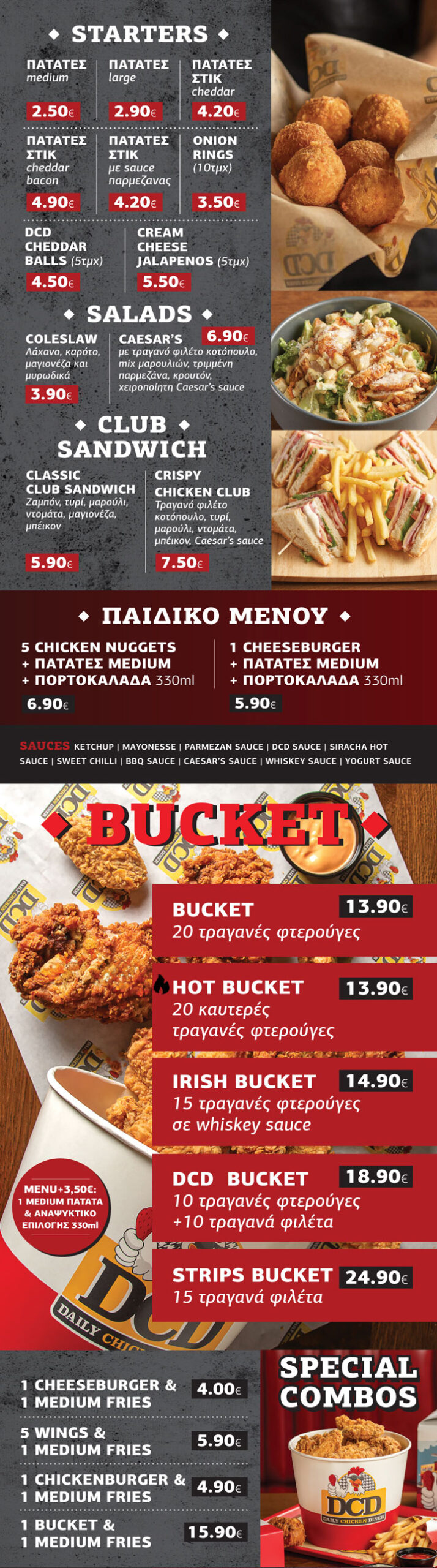 SAUCES: 0,60 €: KETSHUP, MAYONESSE, PARMEZAN SAUCE, DCD SAUSE, SIRACHA HOT SAUCE, SWEET CHILLI,BBQ SAUCE, CAESAR’S SAUCE, WHISKEY SAUCE, YOGURT SAUCE