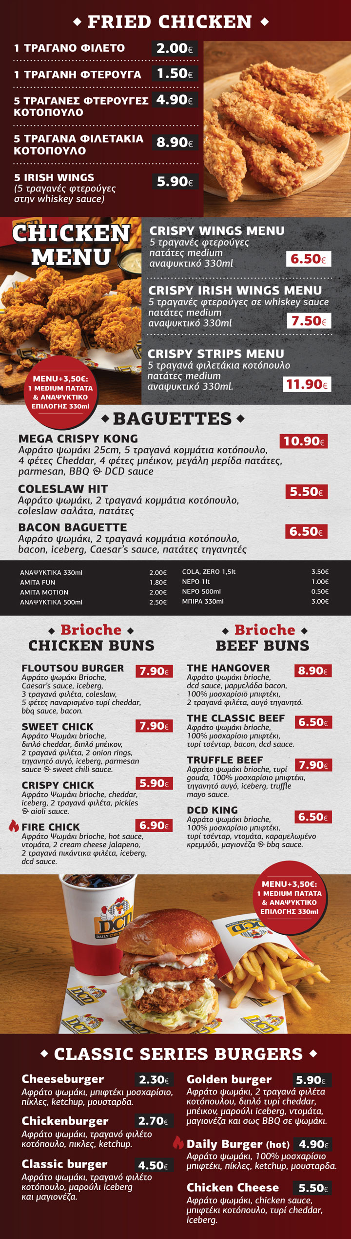 Στα Daily Chicken Diner, το τηγανητό κοτόπουλο γίνεται τέχνη. Λατρεύουμε το crispy, το ζουμερό, το πικάντικο και το ακαταμάχητο! Από Chicken Buckets με τραγανά φιλέτα και φτερούγες – κλασικές ή πικάντικες – μέχρι Burgers, μπαγκέτες και Club Sandwich γεμάτα με τηγανητό κοτόπουλο. Με τα διάσημα Premium Burgers μας, τα απαραίτητα συνοδευτικά και τις μοναδικές sauces μας, είμαστε πάντα έτοιμοι να σου προσφέρουμε ανεπανάληπτη γεύση! Εδώ δεν έρχεσαι απλώς για φαγητό – έρχεσαι για εμπειρία.