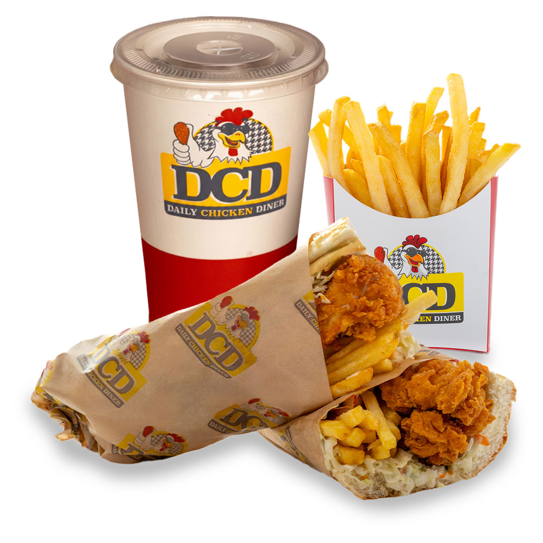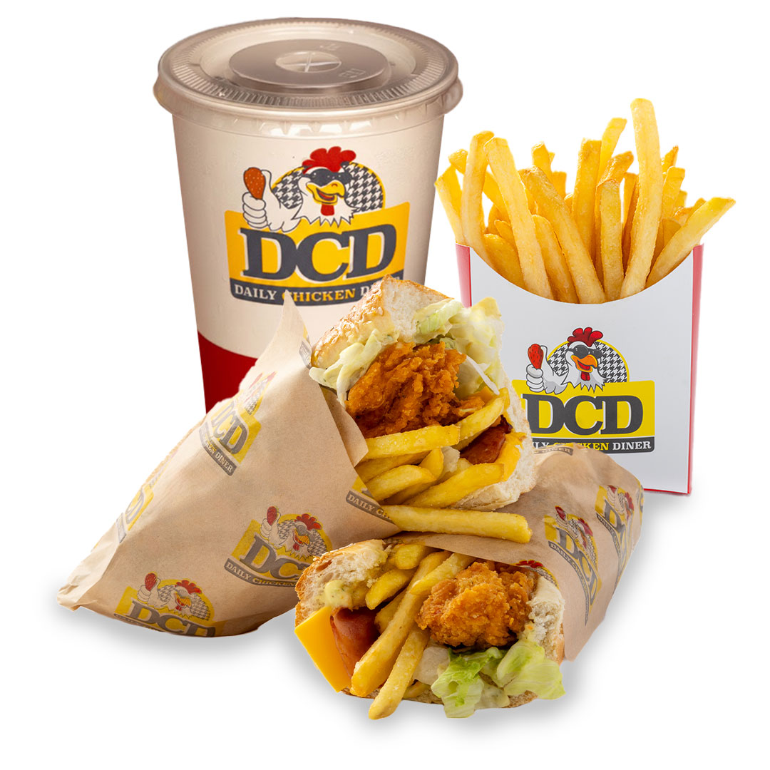 Αφράτο ψωμάκι 25cm, 5 τραγανά κομμάτια κοτόπουλο, 4 φέτες Cheddar, 4 φέτες μπέικον, μεγάλη μερίδα πατάτες, parmesan, BBQ & DCD sauce & πατάτες medium, αναψυκτικό 330ml