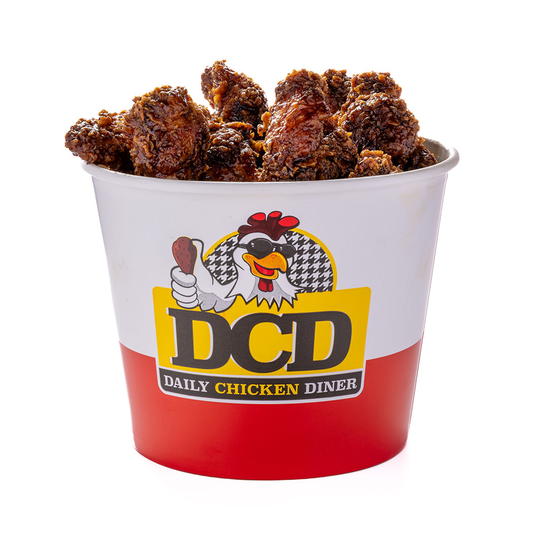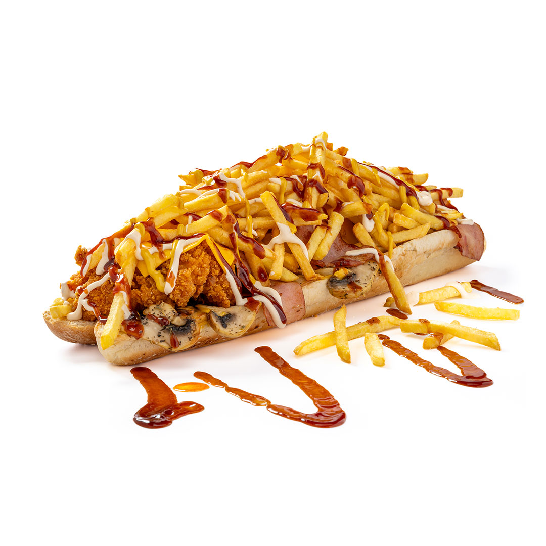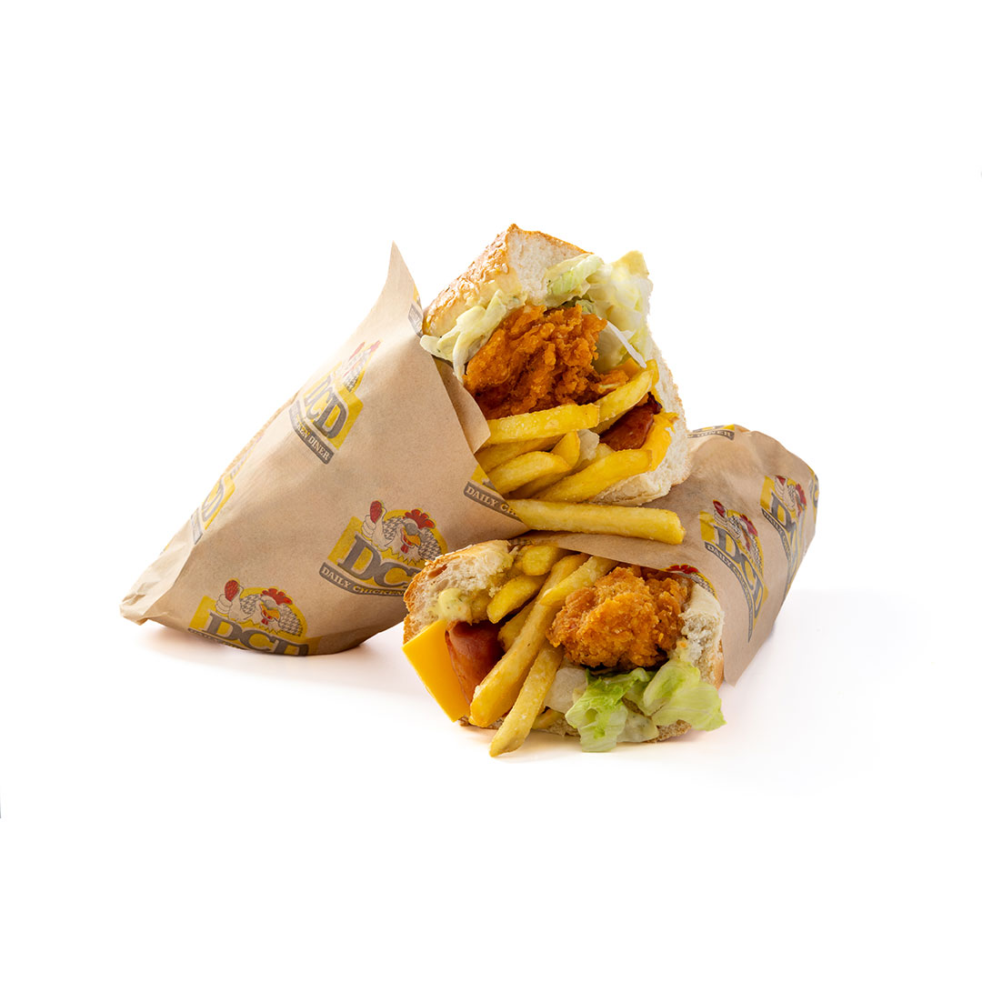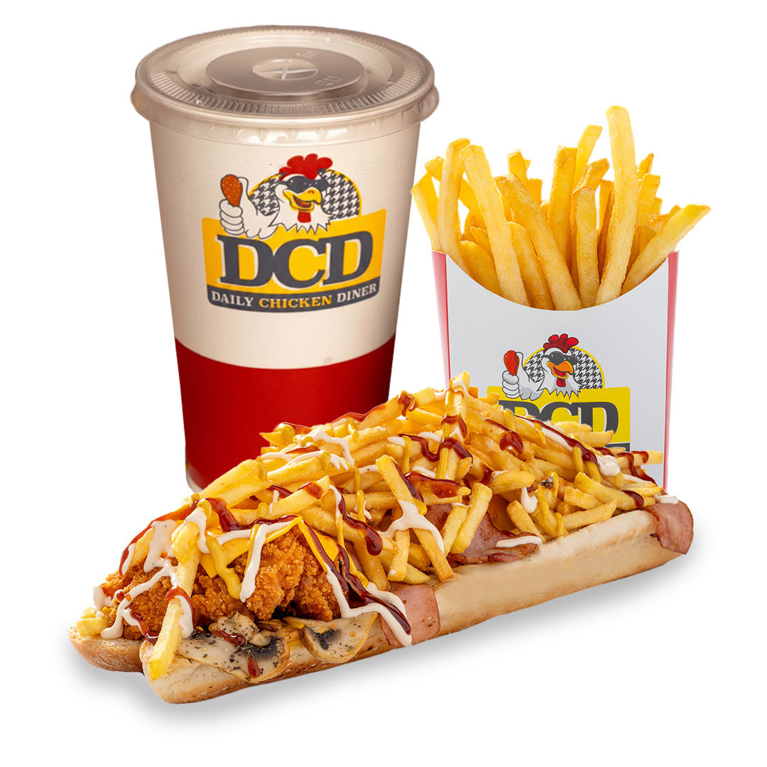 Αφράτο ψωμάκι 25cm, 5 τραγανά κομμάτια κοτόπουλο, 4 φέτες Cheddar, 4 φέτες μπέικον, μεγάλη μερίδα πατάτες, parmesan, BBQ & DCD sauce.