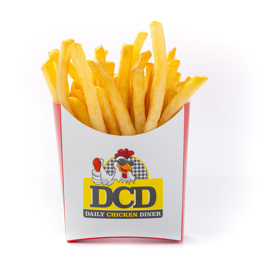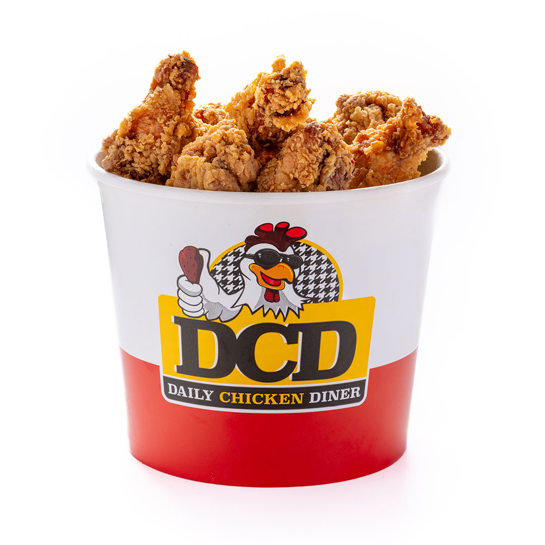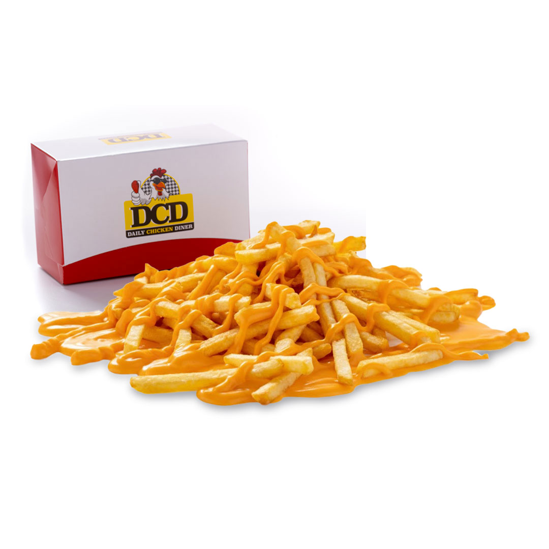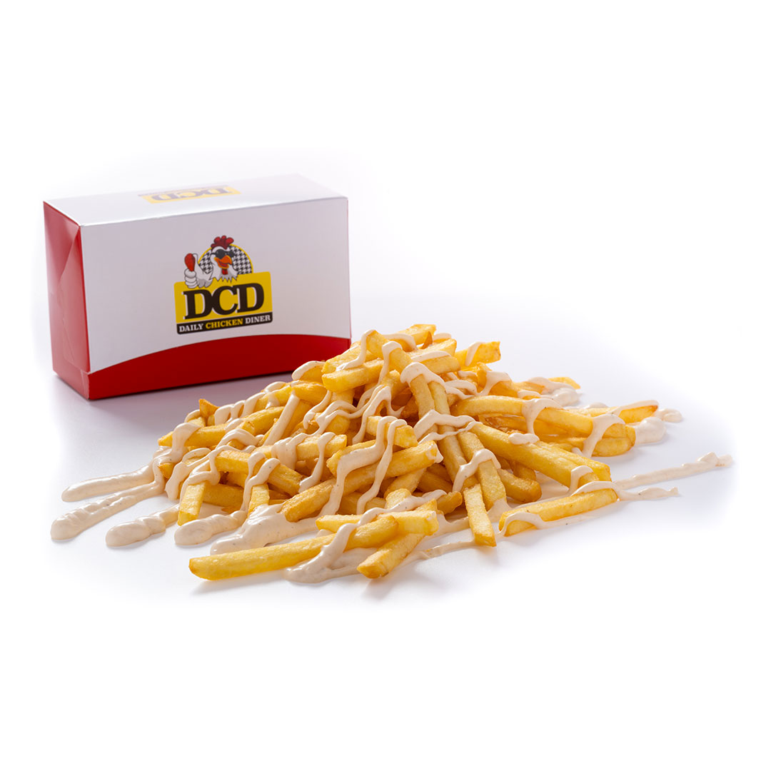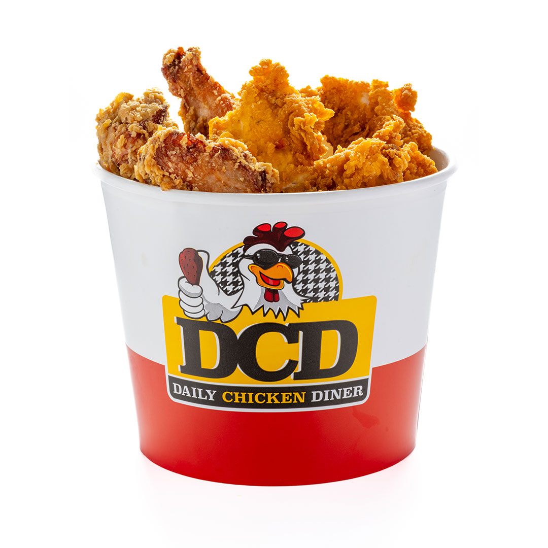 Αφράτο ψωμάκι 25cm, 5 τραγανά κομμάτια κοτόπουλο, 4 φέτες Cheddar, 4 φέτες μπέικον, μεγάλη μερίδα πατάτες, parmesan, BBQ & DCD sauce.