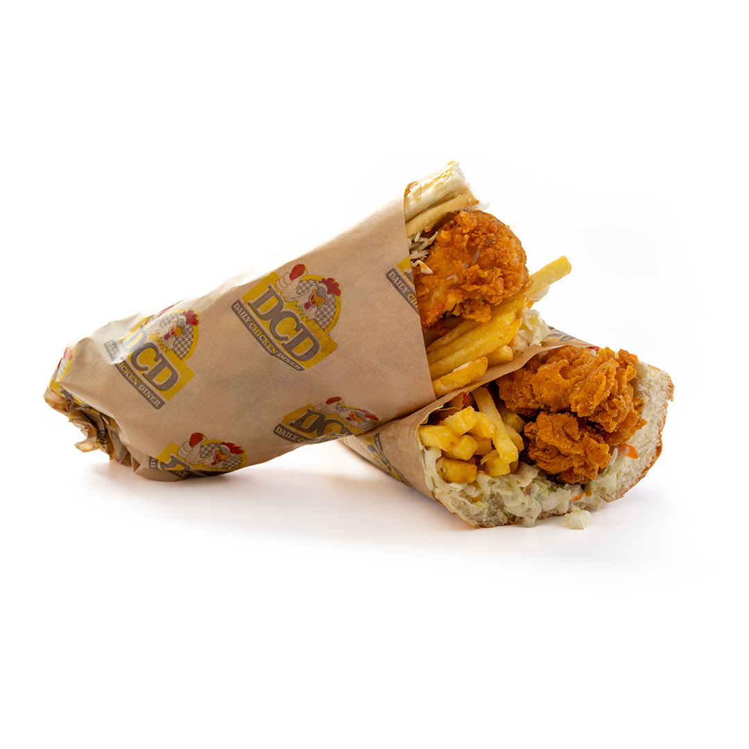 Αφράτο ψωμάκι, 2 τραγανά κομμάτια κοτόπουλο, coleslaw σαλάτα, πατάτες