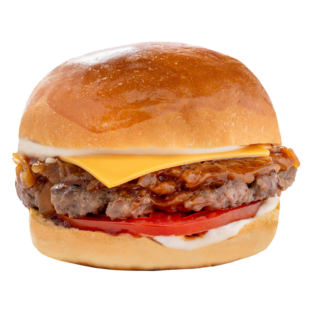 Αφράτο ψωμάκι Brioche, 100% μοσχαρίσιο μπιφτέκι, τυρί τσένταρ, ντομάτα, καραμελωμένο κρεμμύδι, μαγιονέζα & bbq sauce.
