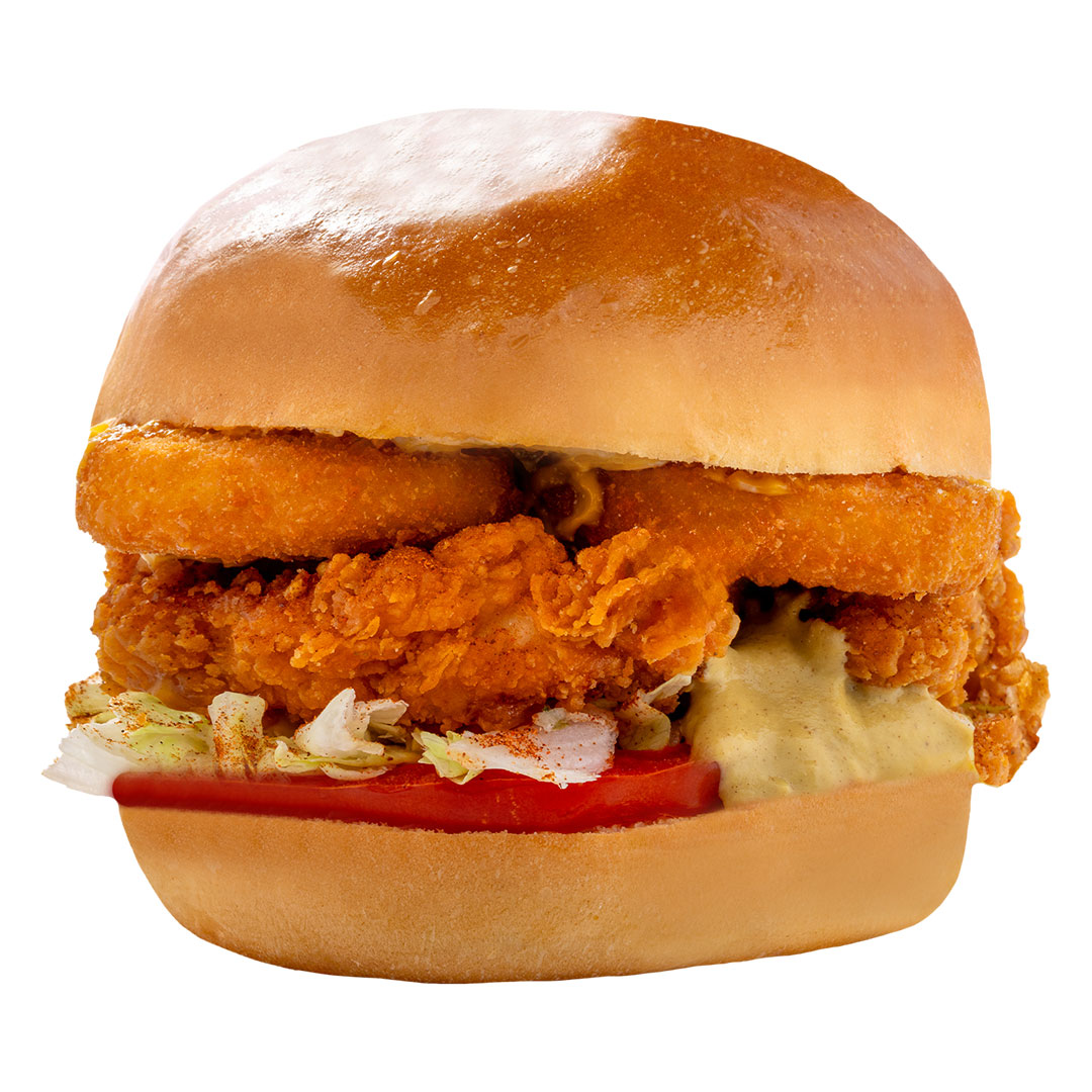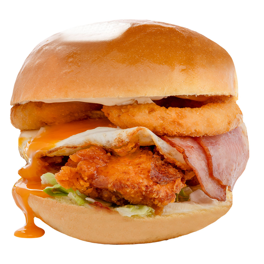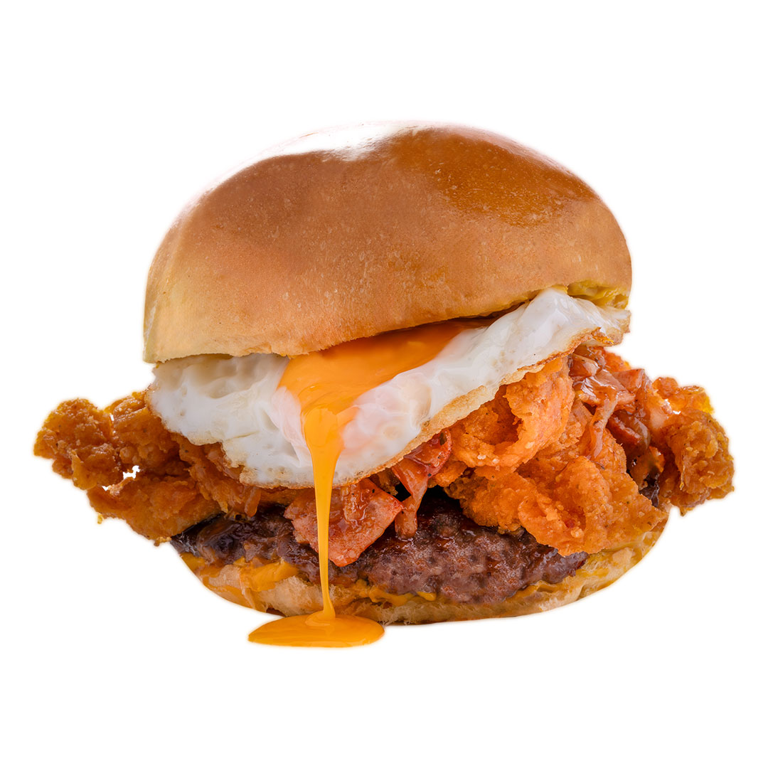 Αφράτο ψωμάκι Brioche, διπλό cheddar, διπλό μπέικον, 2 τραγανά φιλέτα, 2 onion rings, τηγανητό αυγό, iceberg, parmesan sauce & sweet chili sauce.