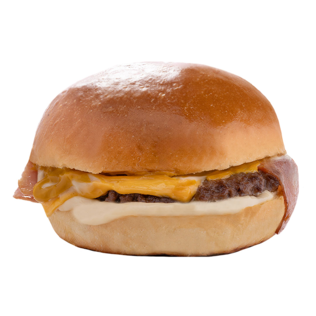 Αφράτο ψωμάκι Brioche, 100% μοσχαρίσιο μπιφτέκι, τυρί τσένταρ, bacon, dcd sauce.