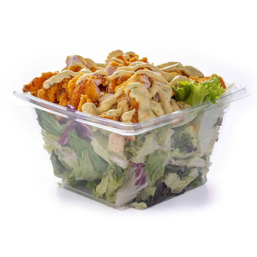 Τραγανό φιλέτο κοτόπουλο, mix μαρουλιών, τριμμένη παρμεζάνα, κρουτόν, χειροποίητη Caesar’s sauce